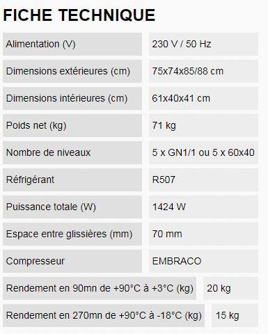 *Réfrigération : 20 Kg d’une T° de +90°C à +3°C en 90 mn