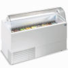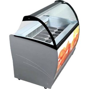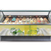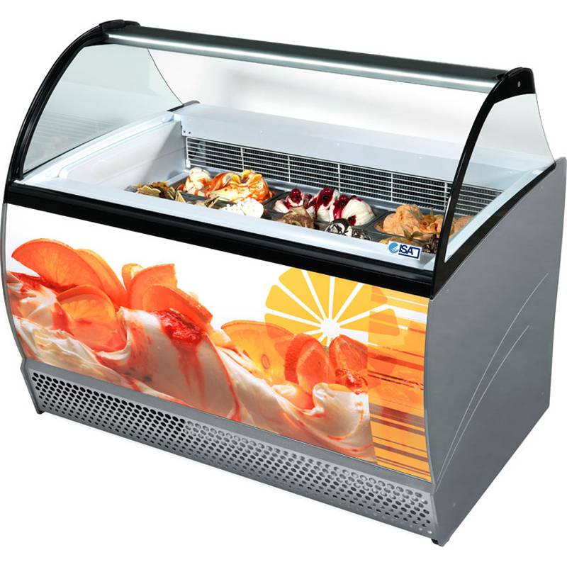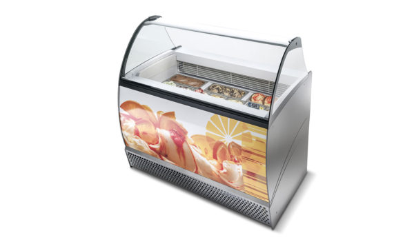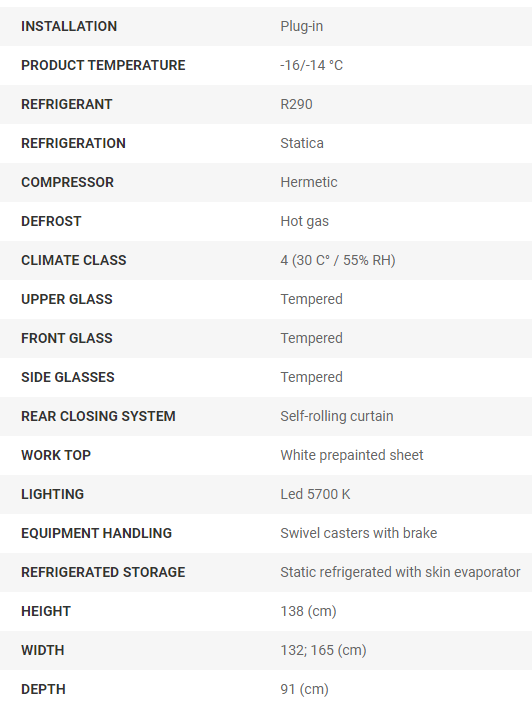 et évaporateur à double ailettes et dégivrage automatique au gaz chaud. Corps monobloc avec isolation en polyuréthane écologique (sans HCFC & HFC), moussé de C02. Réservoir interne et externe en tôle plastifiée; panneaux latéraux stratifiés externes. Cette armoire peut être équipée d’un double niveau de bacs à glace H120 et elle est équipée d’une cellule de stockage avec évaporateur interne en mousse. Structure en verre bombé trempé LX et auvent d’éclairage Led. Fermeture côté opérateur avec rideau roulant de vente. Plan de travail en tôle plastifiée. Groupe de condensation hermétique intégré avec tableau de commande électronique. Structure principale en acier au carbone peint à la poudre, 4 roues pivotantes pour une manipulation plus facile.