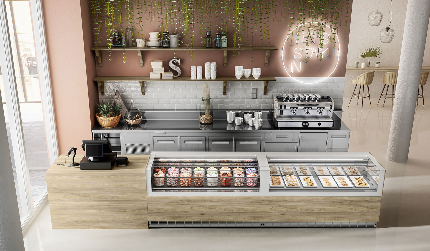 Un design unique et une présentation spectaculaire des glaces sont la clé de OneShow. Les dimensions sont réduites à l’essentiel (le meuble n’a que 740 mm de profondeur) et il existe une large gamme de matériaux et de finitions au choix, qui permettent des combinaisons infinies d’agencement.